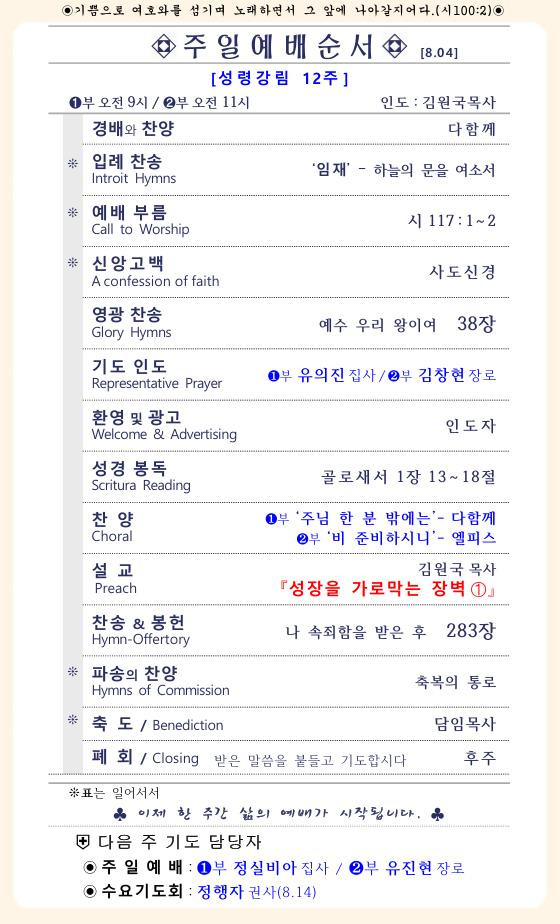 1) 예배 및 모임 안내 ➀주일예배 : ❶부 9시 ❷부 11시에 임마누엘 성전(2층)에서 드립니다. ②구 역 - 소모임 : 주일과 주중에 반드시 정기적으로 모입시다. ③수요 성경공부 기도회 : 이번 주(7일)는 쉽니다. ④새벽 기도회 : 이번 주간(5~10일)은 개인 기도합니다. 2) 당회 예고 : 다음 주일(11일) 2부 예배 후 당회실에서 모입니다. 3) 교역자 휴가 : 담임목사, 5(월)~10일(토)은 휴가 기간입니다. 4) 사역 휴식 : 오늘 점심은 간식으로 대체하며 ‘성령의 바람’도 쉽니다. 5) 주방 봉사 : 다음 주(8.11) – 충성구역 / 8.18 – 양선구역 ♧. 새생명 전도 축제 : 창립기념 주일(10.6) - ‘하자분’ 작정합시다. ☞ 텃밭 만들기 – 하자분 작정, 게시 : 8월 18일 ☞ 밭 가꾸기 – 새생명 전도 축제 선포식 : 8월 25일 ☞ 거름주기 – 영적 비타민 새벽 부흥회(집중기도) : 9월 2일~7일 ☞ 열매 거두기 – 초대하기(새생명 전도 축제) : 10월 6일