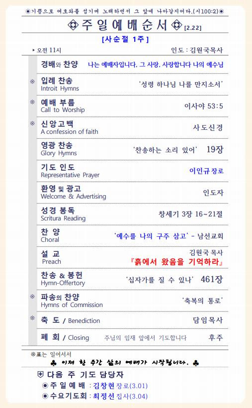 ◉ 주 일 예 배 : 김창현 장로(3.01)